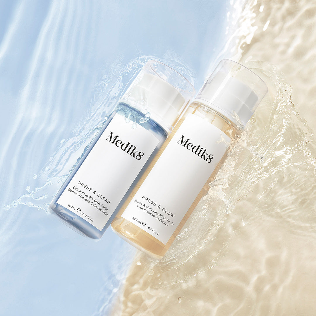 At Medik8, we have two clinically proven stars of daily acid toning: Press & Glow and Press & Clear. Born out of the need for powerful, exfoliating acid toners that can be used every day, twice a day, both formulations are non-drying, non-sticky and always gentle on the skin. Press & Glow and Press & Clear are suitable for all skin types, including sensitive skins. The perfect upgrade to your daily Medik8 regime.
