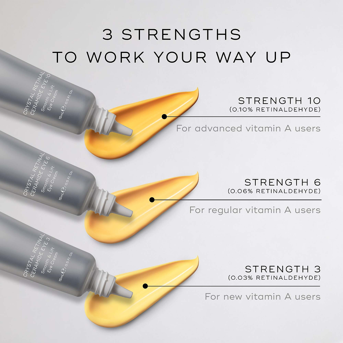 Find your match. Crystal Retinal Ceramide Eye is available in a series of 3 progressive retinal strengths to ladder up results when you’re ready (0.03% - 0.1% retinal). Our lowest strength (3) is designed for very sensitive skins or those new to vitamin A, while the higher strengths give more experienced vitamin A users the opportunity to intensify their results over time. With Crystal Retinal Ceramide Eye, we have introduced progressive results to the retinal eye category - to ensure your results always peak, never plateau.